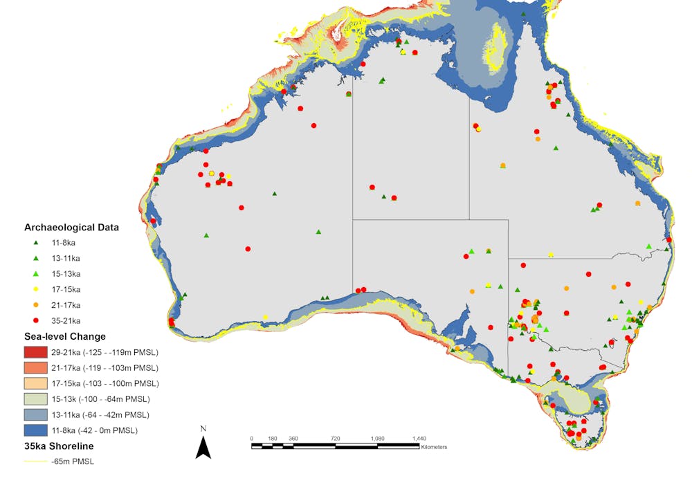 Map of Australia showing sea level change and archaeological sites